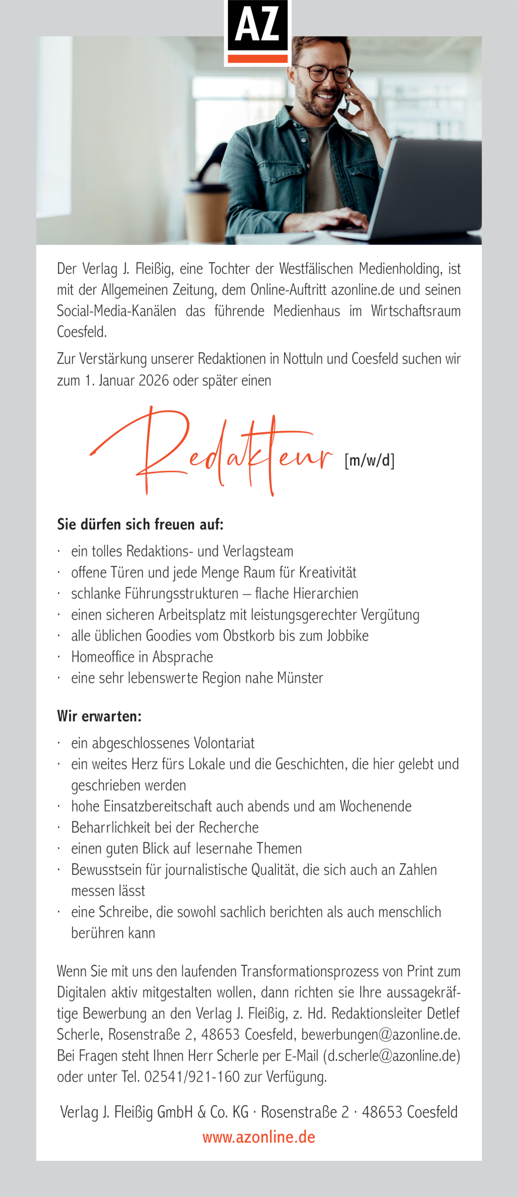 Wenn Sie mit uns den laufenden Transformationsprozess von Print zum Digitalen aktiv mitgestalten wollen, dann richten Sie Ihre aussagekräftige Bewerbung an den Verlag J. Fleißig, z. Hd. Redaktionsleiter Detlef Scherle, Rosenstraße 2, 48653 Coesfeld, bewerbungen@azonline.de