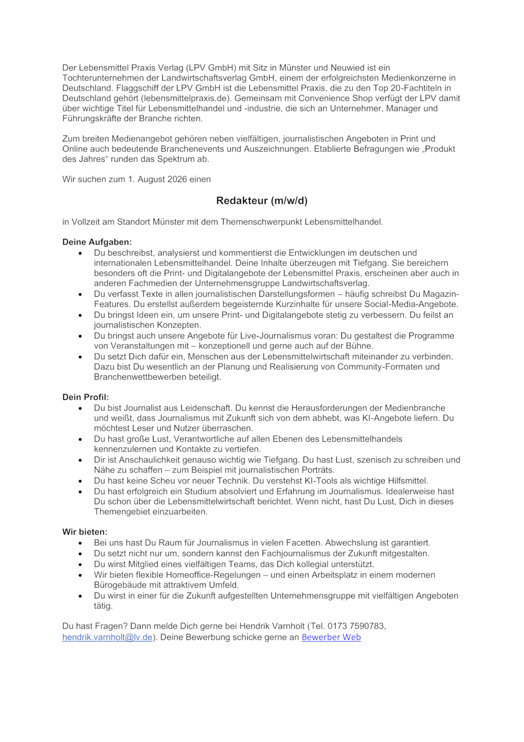 - Du beschreibst, analysierst und kommentierst die Entwicklungen im deutschen und internationalen Lebensmittelhandel. Deine Inhalte überzeugen mit Tiefgang. Sie bereichern besonders oft die Print- und Digitalangebote der Lebensmittel Praxis, erscheinen aber auch in anderen Fachmedien der Unternehmensgruppe Landwirtschaftsverlag.