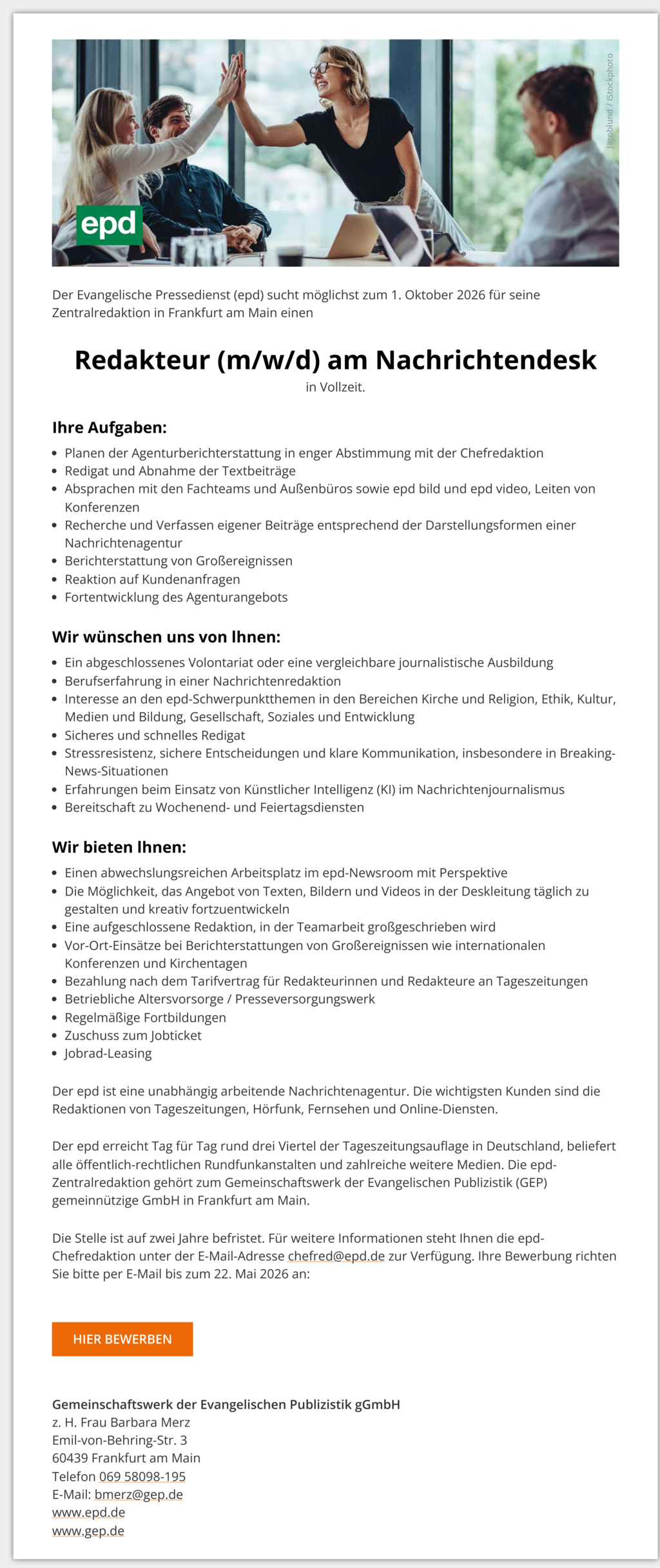 - Einen abwechslungsreichen Arbeitsplatz im epd-Newsroom mit Perspektive