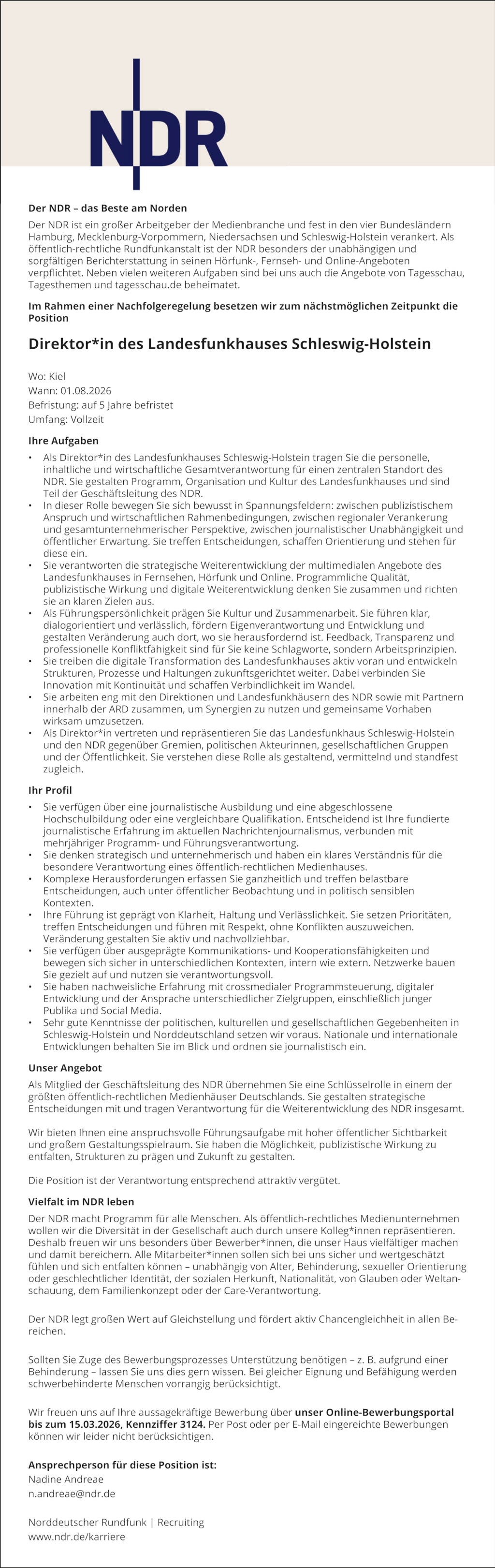 - Als Direktor*in des Landesfunkhauses Schleswig-Holstein tragen Sie die personelle, inhaltliche und wirtschaftliche Gesamtverantwortung für einen zentralen Standort des NDR. Sie gestalten Programm, Organisation und Kultur des Landesfunkhauses und sind Teil der Geschäftsleitung des NDR.