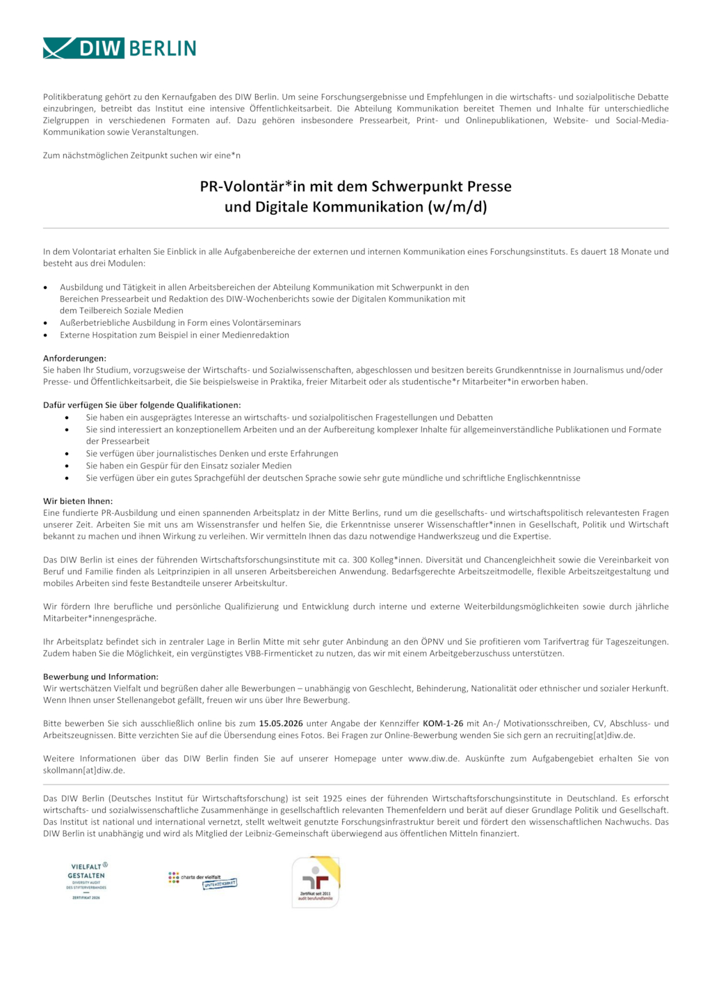 Bitte bewerben Sie sich ausschließlich online bis zum 15.05.2026 unter Angabe der Kennziffer KOM-1-26 mit An-/ Motivationsschreiben, CV, Abschluss- und Arbeitszeugnissen. Bitte verzichten Sie auf die Übersendung eines Fotos. Bei Fragen zur Online-Bewerbung wenden Sie sich gern an recruiting[at]diw.de.