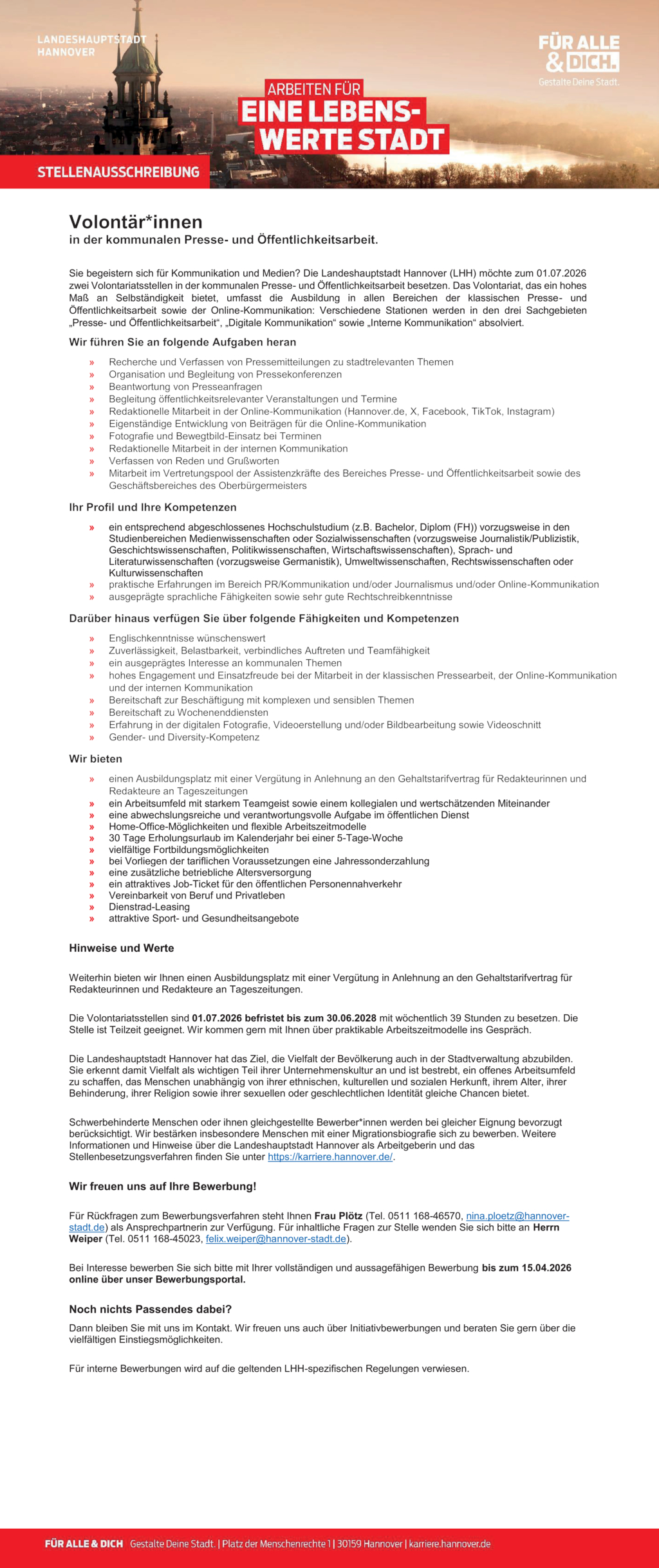 Sie begeistern sich für Kommunikation und Medien? Die Landeshauptstadt Hannover (LHH) möchte zum 01.07.2026 zwei Volontariatsstellen in der kommunalen Presse- und Öffentlichkeitsarbeit besetzen. Das Volontariat, das ein hohes Maß an Selbständigkeit bietet, umfasst die Ausbildung in allen Bereichen der klassischen Presse- und Öffentlichkeitsarbeit sowie der Online-Kommunikation: Verschiedene Stationen werden in den drei Sachgebieten „Presse- und Öffentlichkeitsarbeit“, „Digitale Kommunikation“ sowie „Interne Kommunikation“ absolviert.