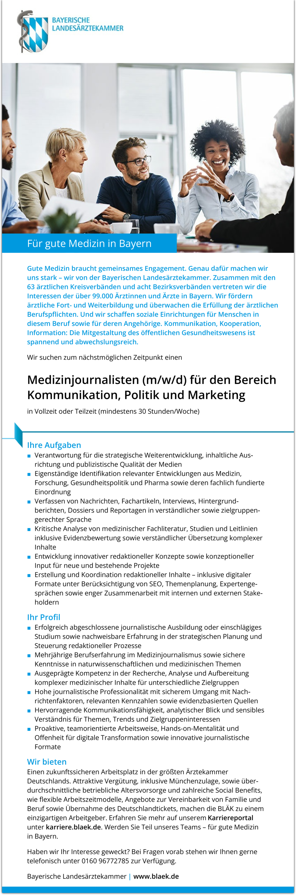 Einen zukunftssicheren Arbeitsplatz in der größten Ärztekammer Deutschlands. Attraktive Vergütung, inklusive Münchenzulage, sowie über-durchschnittliche betriebliche Altersvorsorge und zahlreiche Social Benefits, wie flexible Arbeitszeitmodelle, Angebote zur Vereinbarkeit von Familie und Beruf sowie Übernahme des Deutschlandtickets, machen die BLÄK zu einem einzigartigen Arbeitgeber. Erfahren Sie mehr auf unserem Karriereportal unter karriere.blaek.de. Werden Sie Teil unseres Teams – für gute Medizin in Bayern.
