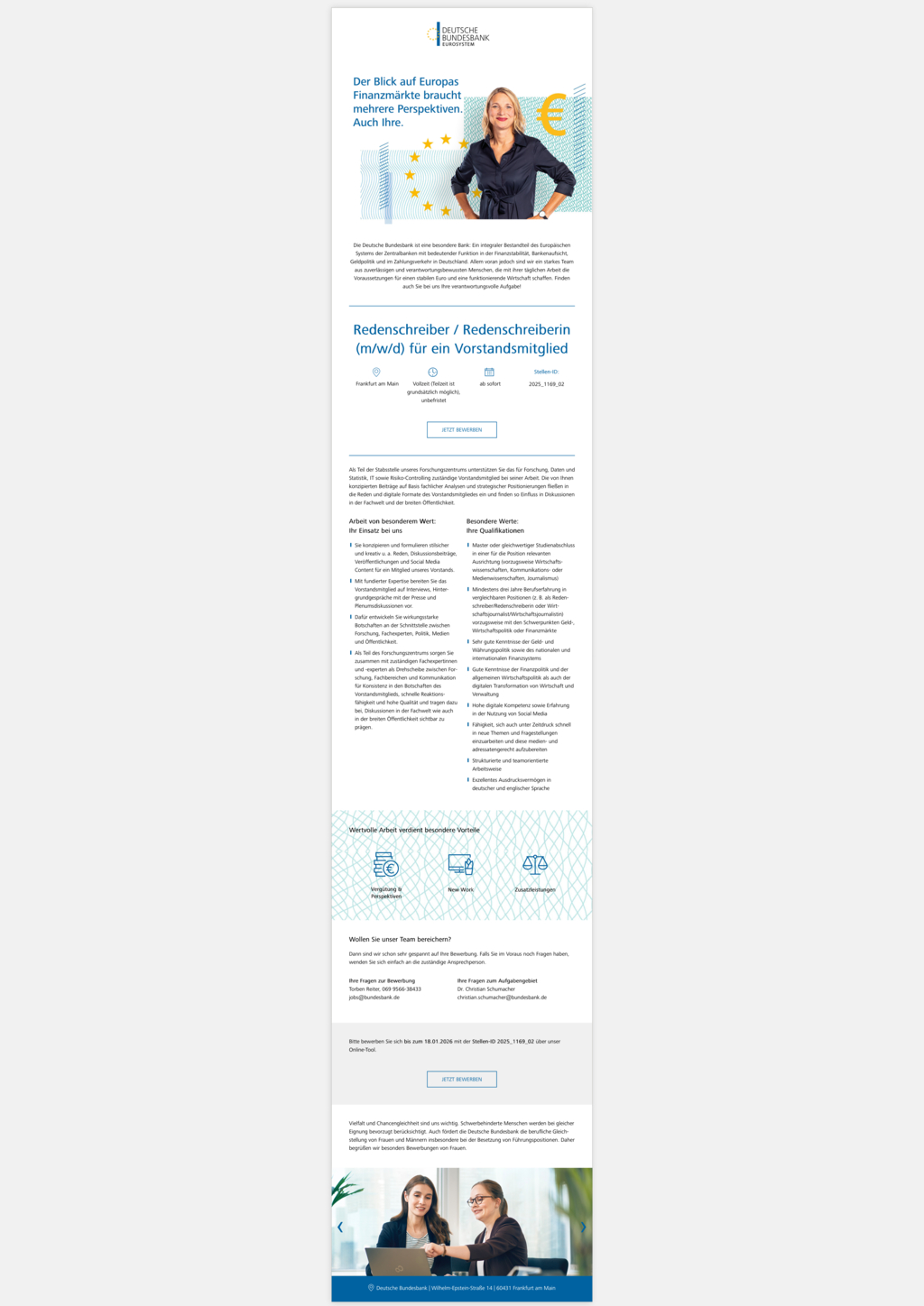 Die Deutsche Bundesbank ist eine besondere Bank: Ein integraler Bestandteil des Europäischen Systems der Zentralbanken mit bedeutender Funktion in der Finanzstabilität, Bankenaufsicht, Geldpolitik und im Zahlungsverkehr in Deutschland. Allem voran jedoch sind wir ein starkes Team aus zuverlässigen und verantwortungsbewussten Menschen, die mit ihrer täglichen Arbeit die Voraussetzungen für einen stabilen Euro und eine funktionierende Wirtschaft schaffen. Finden auch Sie bei uns Ihre verantwortungsvolle Aufgabe!