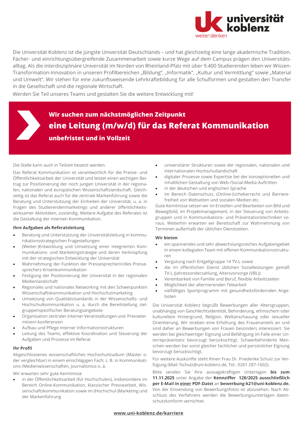Bitte senden Sie Ihre aussagekräftigen Unterlagen bis zum 11.11.2025 unter Angabe der Kennziffer 128/2025 ausschließlich per E-Mail in einer PDF-Datei an bewerbung-k21@uni-koblenz.de. Von der Einsendung von Bewerbungsfotos ist abzusehen. Nach Abschluss des Verfahrens werden die Bewerbungsunterlagen datenschutzkonform vernichtet.