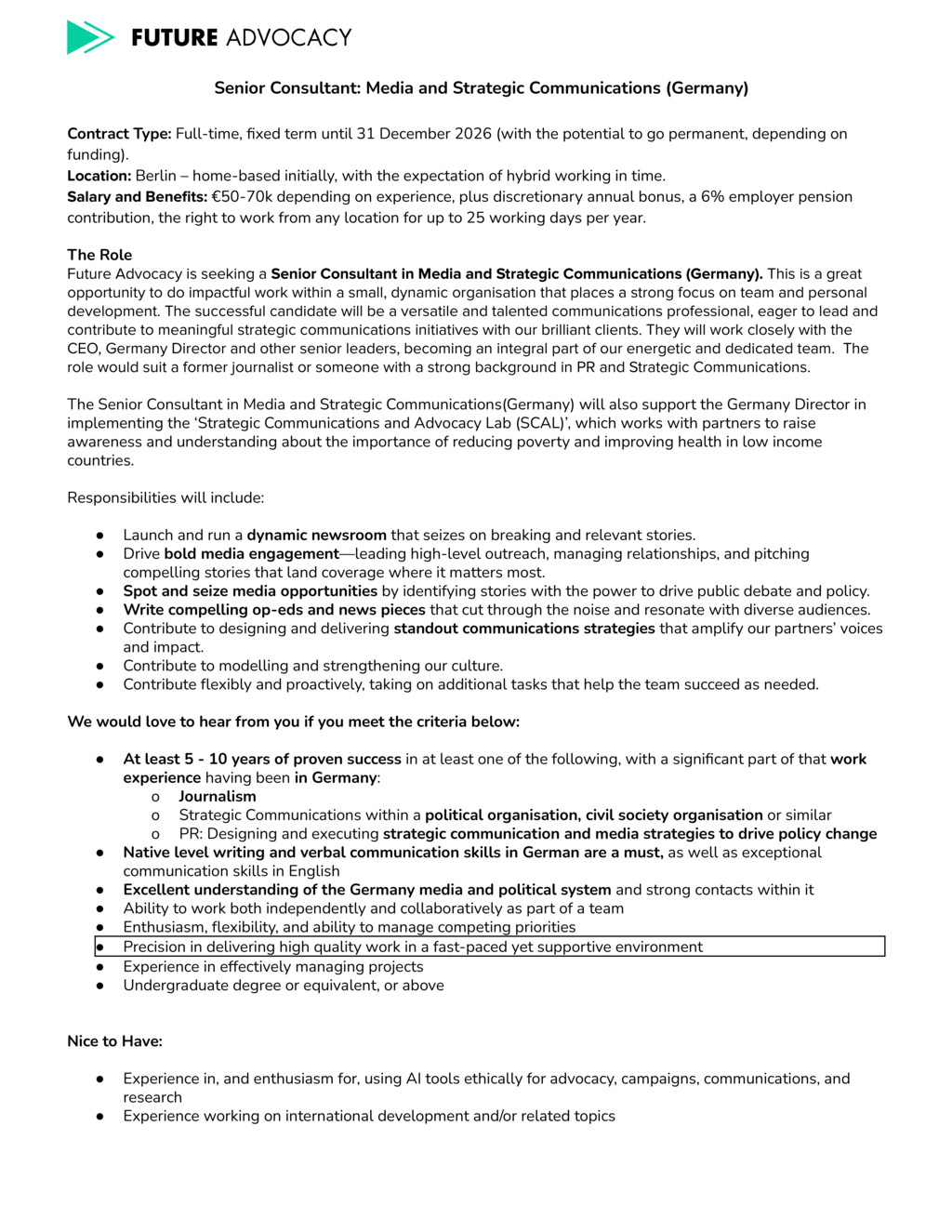Future Advocacy is seeking a Senior Consultant in Media and Strategic Communications (Germany). This is a great opportunity to do impactful work within a small, dynamic organisation that places a strong focus on team and personal development. The successful candidate will be a versatile and talented communications professional, eager to lead and contribute to meaningful strategic communications initiatives with our brilliant clients. They will work closely with the CEO, Germany Director and other senior leaders, becoming an integral part of our energetic and dedicated team. The role would suit a former journalist or someone with a strong background in PR and Strategic Communications.