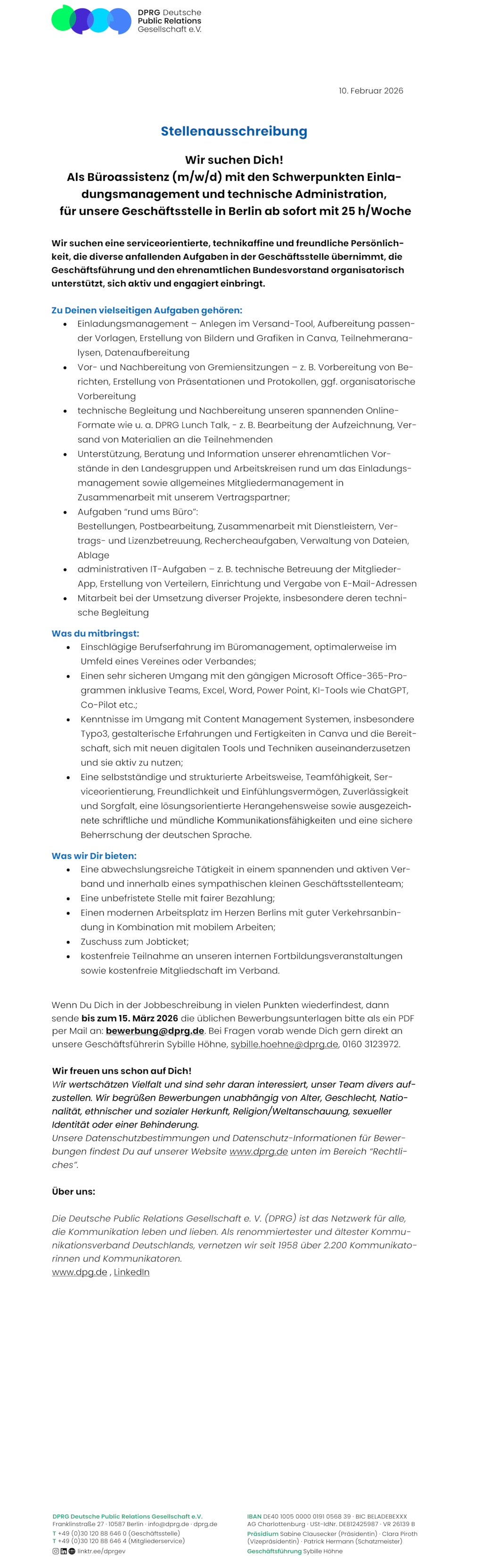 Wenn Du Dich in der Jobbeschreibung in vielen Punkten wiederfindest, dann sende bis zum 15. März 2026 die üblichen Bewerbungsunterlagen bitte als ein PDF per Mail an: bewerbung@dprg.de. Bei Fragen vorab wende Dich gern direkt an unsere Geschäftsführerin Sybille Höhne, sybille.hoehne@dprg.de, 0160 3123972.